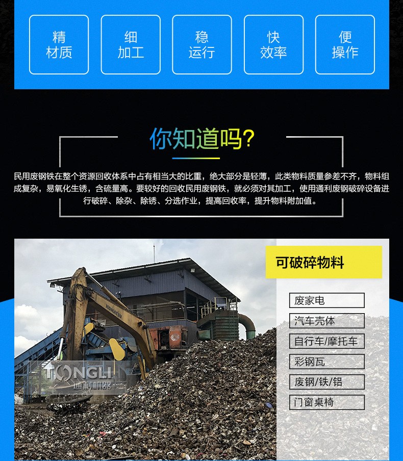 廢鋼破碎機(jī)是結(jié)合市場需求而成的產(chǎn)品。主要針對量廢棄金屬的再生利用,進(jìn)行預(yù)破碎處理,并清理表面的油漆和污垢。該機(jī)產(chǎn)能每小時(shí)3T左右。