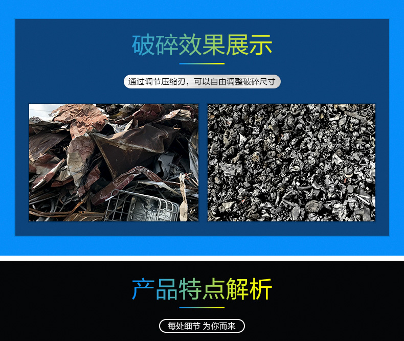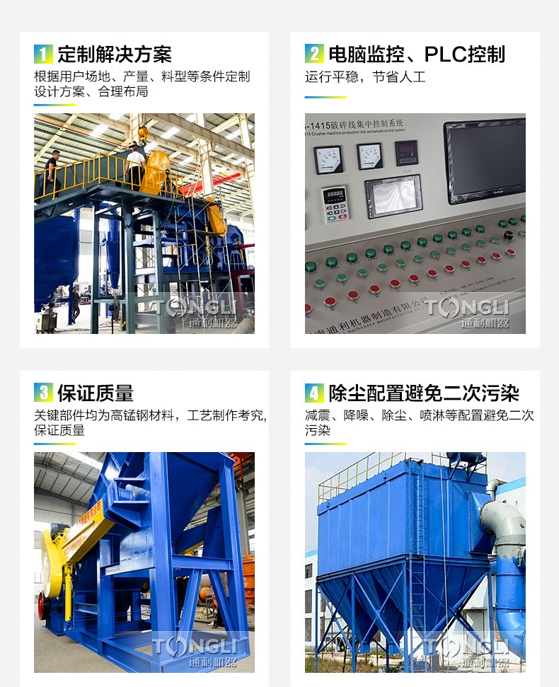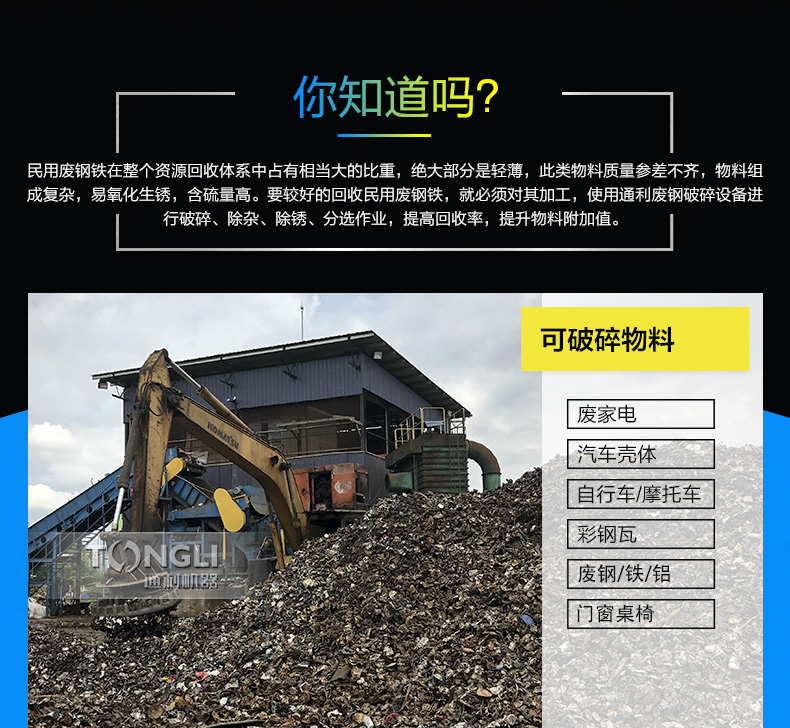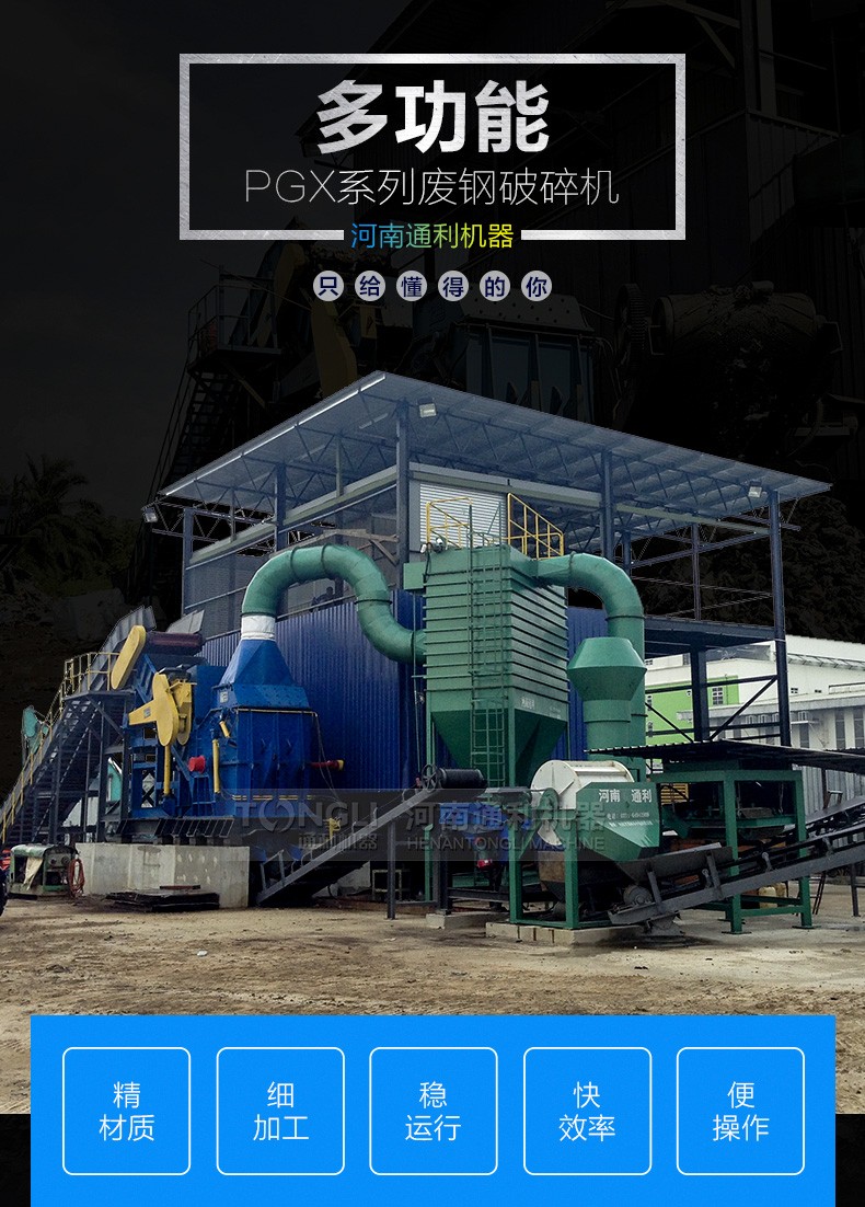 本生產線主要用于加工廢車體、馬口鐵類、家電制品、自行車、空罐等下等廢屑使之成為上級的制鋼原料。通過本機不斷粉碎、除去涂膜、提體積比重、投電爐中防止爆炸、在一定情況下提升溶解率等。