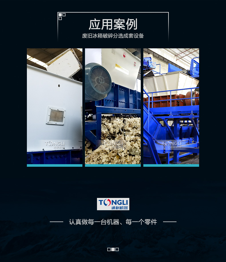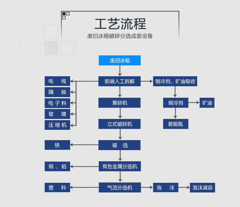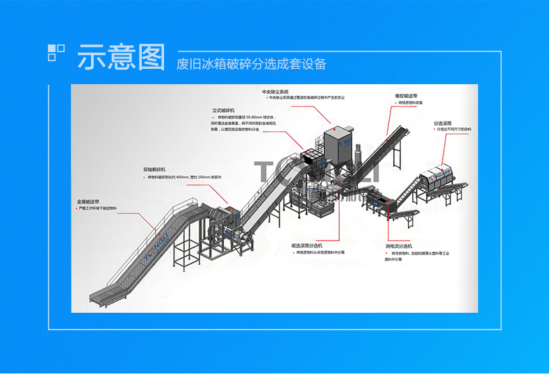 本生產(chǎn)線由重型金屬撕碎機(jī)進(jìn)行粗碎,然后經(jīng)過(guò)立式破碎機(jī)進(jìn)行破碎細(xì)化處理。再粉碎過(guò)程中采用除塵系統(tǒng)對(duì)處理過(guò)程中產(chǎn)生的粉塵進(jìn)行凈化。經(jīng)過(guò)處理的物料通過(guò)磁、渦電流、氣流等分設(shè)備,分離出來(lái)銅、鐵、鋁等可循環(huán)利用的冶煉原料。本系統(tǒng)由PLC控制,操作靈活簡(jiǎn)便,具有能耗低、處理量、經(jīng)濟(jì)效益,維護(hù)成本低、處理效果等特點(diǎn)。